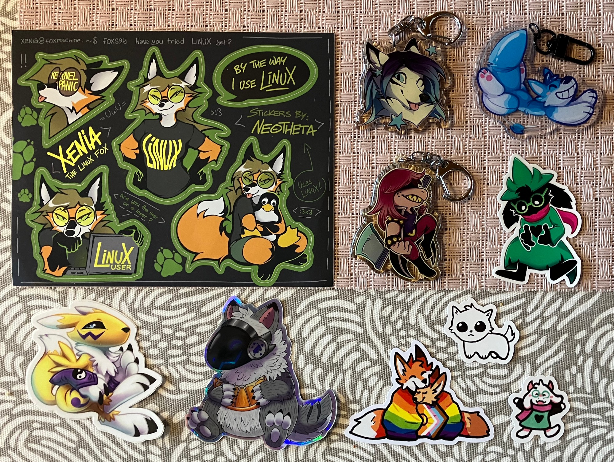 stickers: fox, night sky fox, pansexual deer; pins: Eevee variations, small fox with rainbow flag, Amaterasu; charms: fox, Biyomon