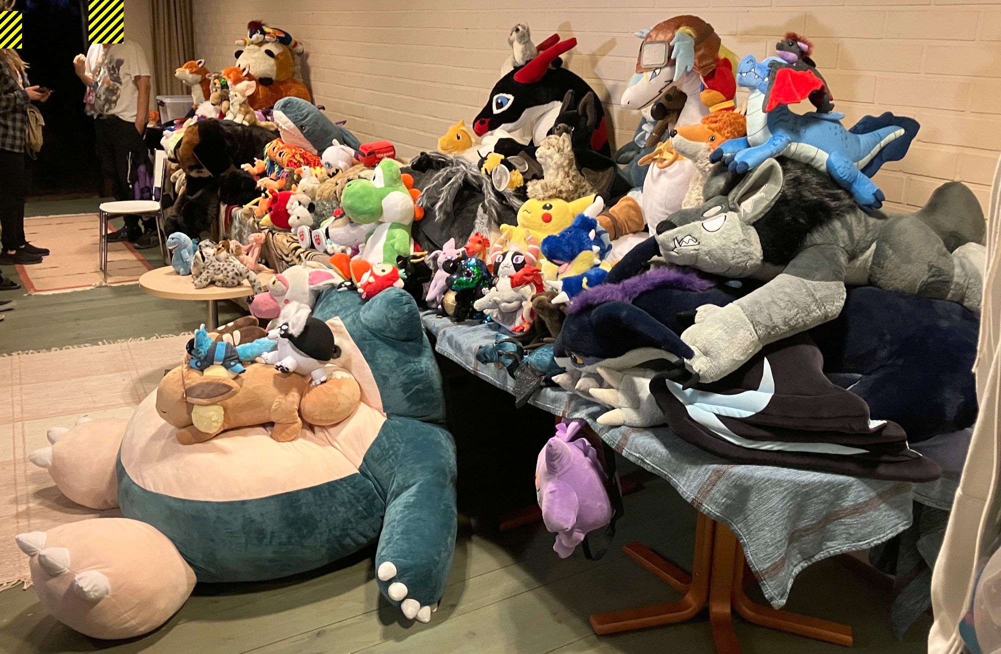 many plushies on a table and on the floor: e.g. IKEA Blåhaj, Pikachu, Snorlax, Angry Bird, Shiron the Windragon (large one with aviator hat)