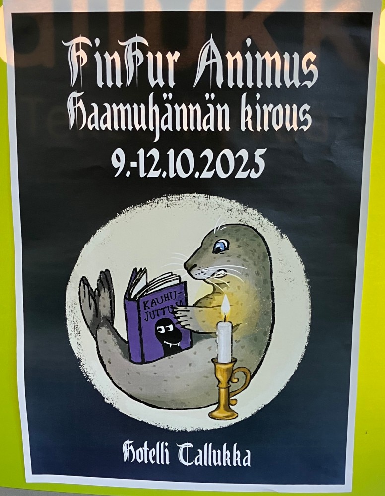 FinFur Animus, Haamuhännän kirous, 9 to 12 October 2025, Hotelli Tallukka; a drawing of an otter reading horror stories in candlelight