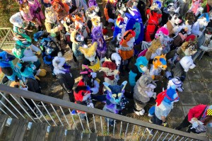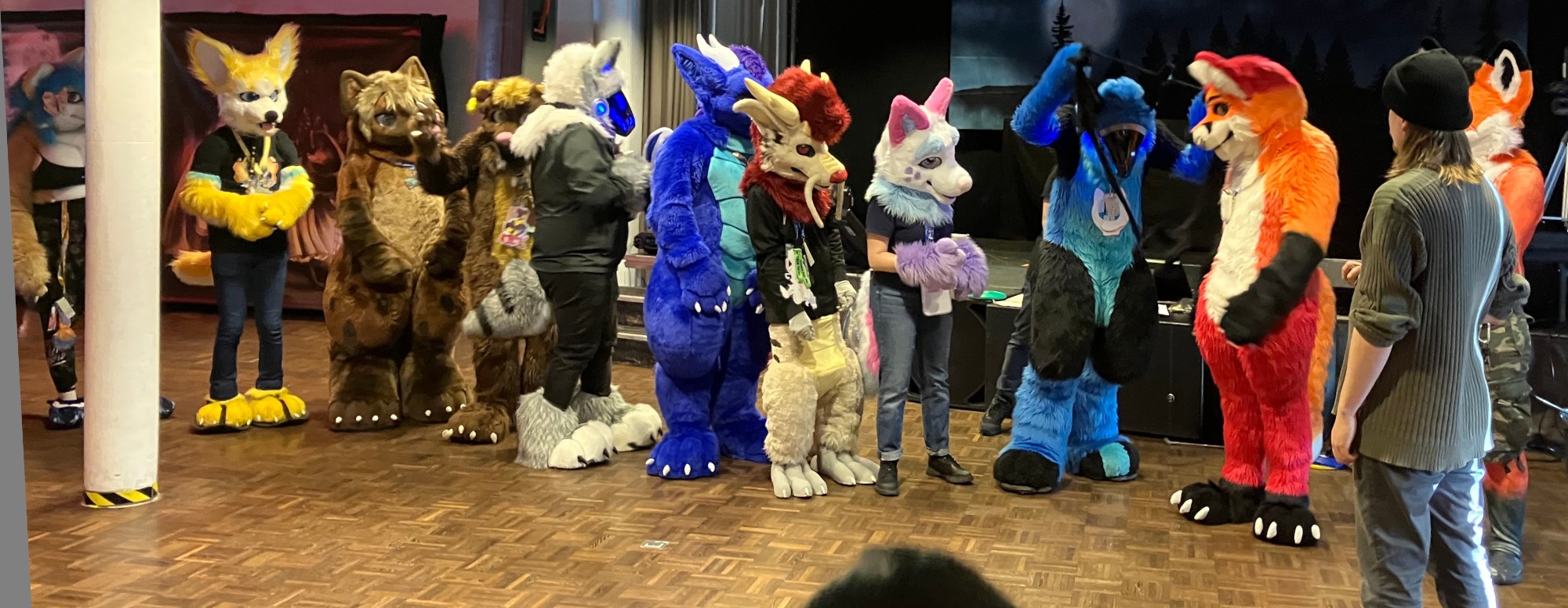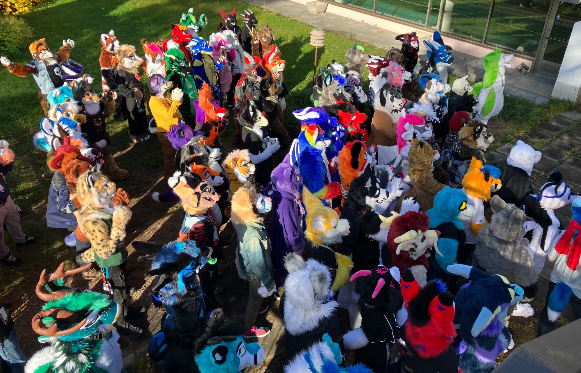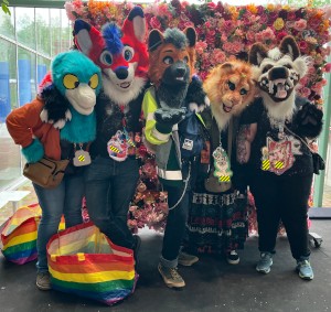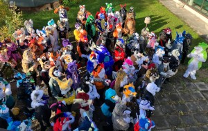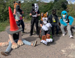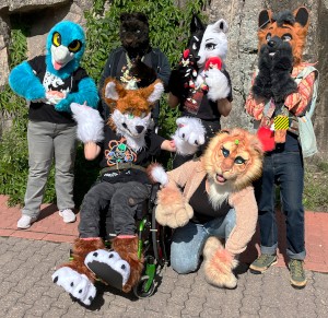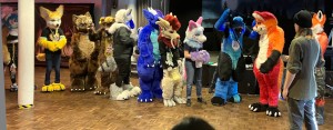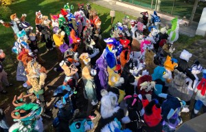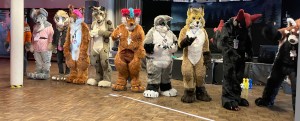 fursuiters standing in a tight group outside