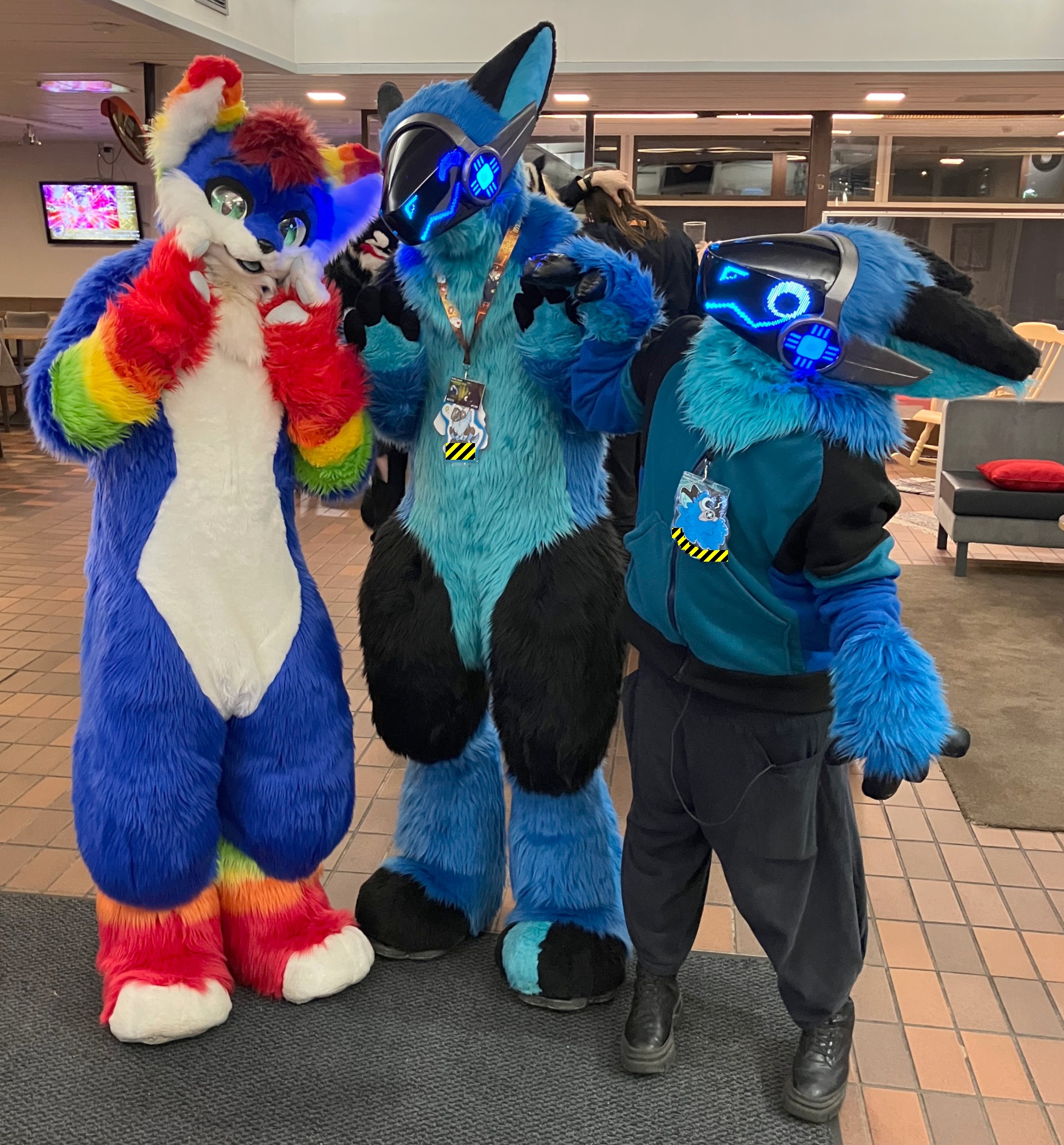 a blue/white/rainbow canine, two blue/black protogens