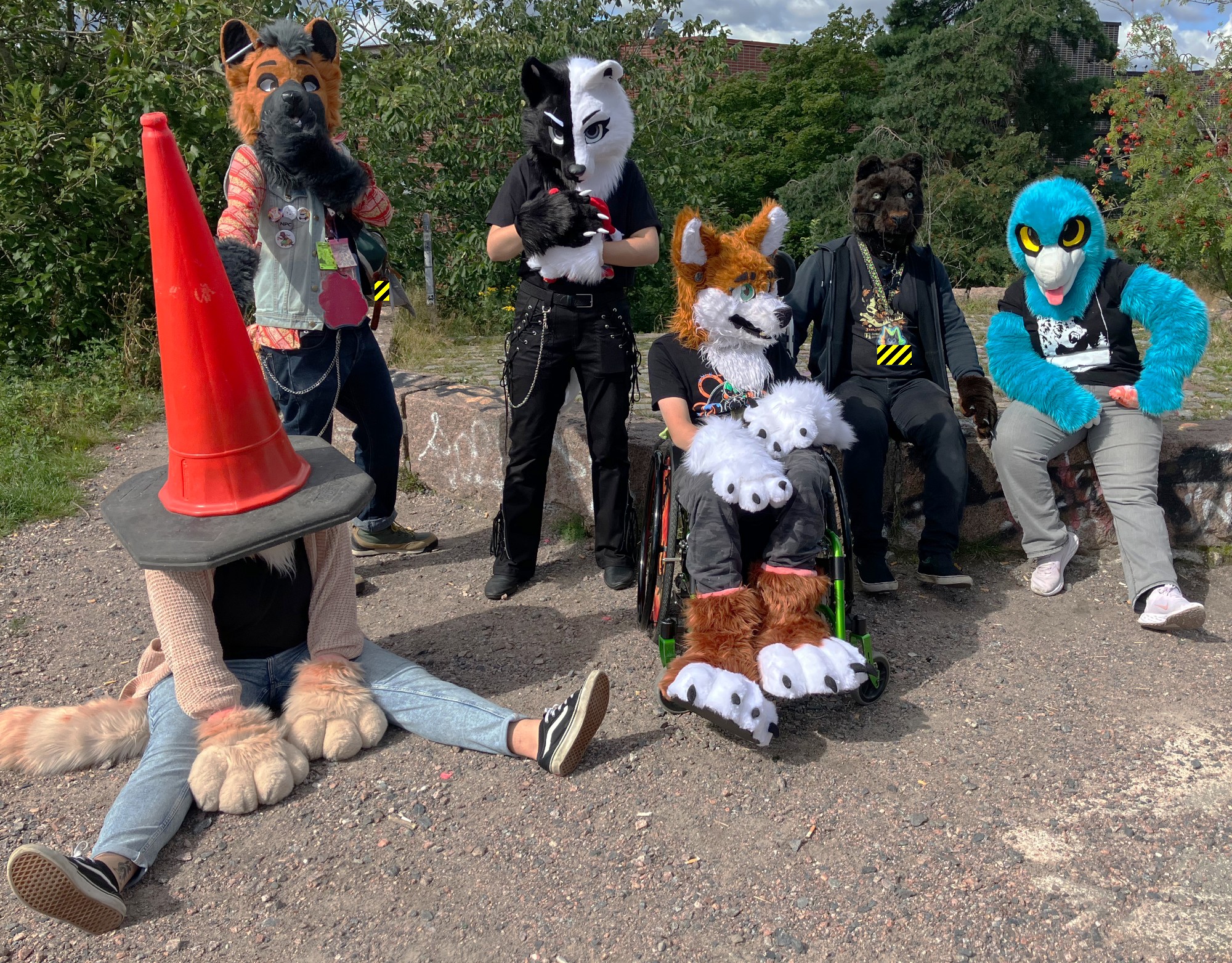 six fursuiters outside: blue avian, black feline, black/white canine, brown/black canine, brown/white canine, light brown feline