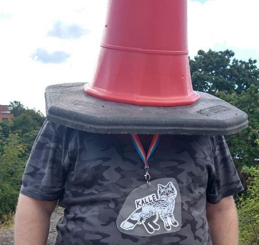 a white 40-year man in a grey camo T-shirt, with a traffic cone on his head, and a drawing of his fursona, a feral black/light grey canine, on his neck