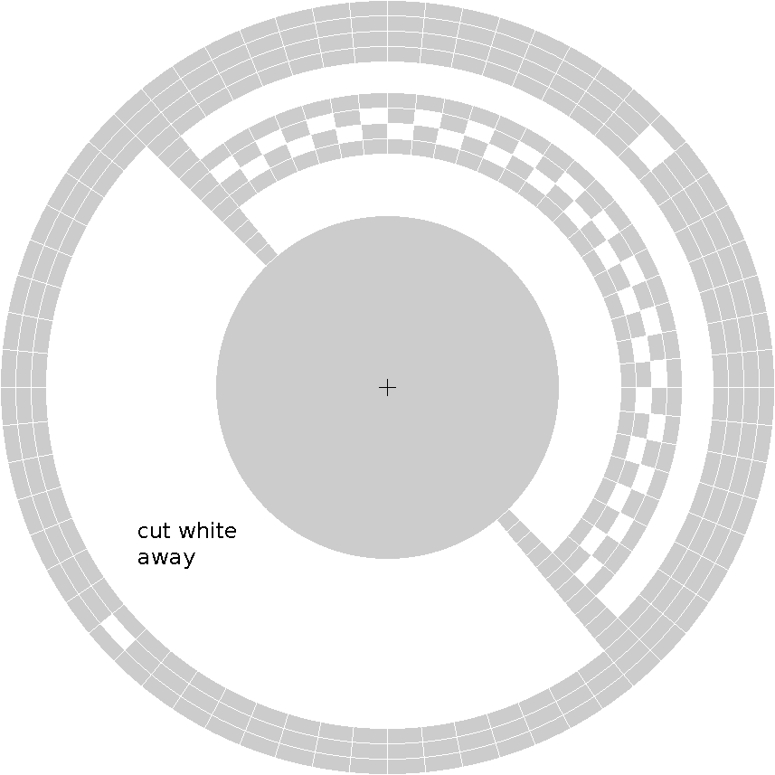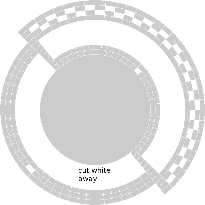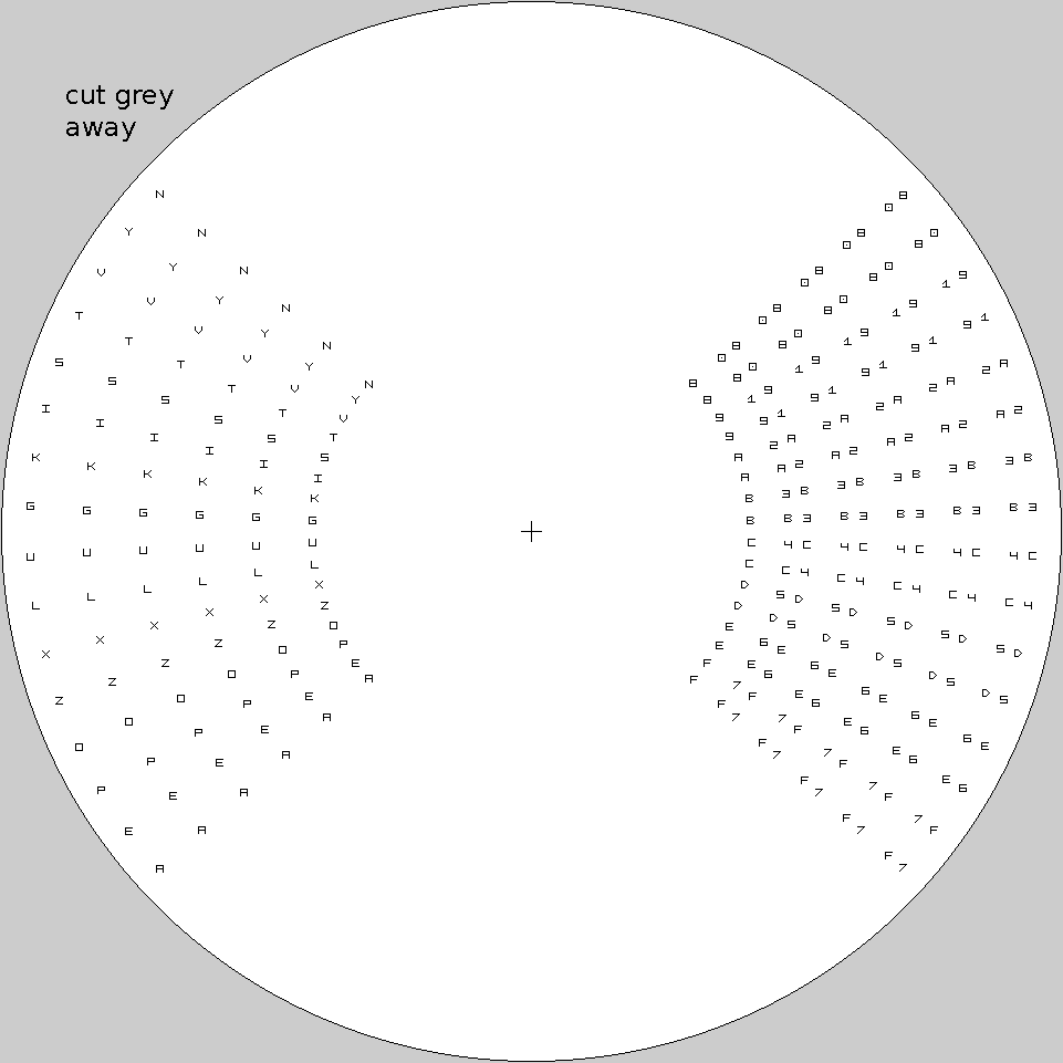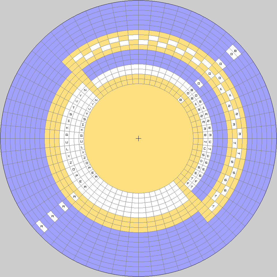 The code wheel consists of seven concentric discs (e.g. circular pieces of paper pinned together in the centre). All the text is on the bottom disc. The other discs are “mask discs” and have holes in them. Each letter or digit on the bottom disc can only be seen if all the other discs have a hole above it.